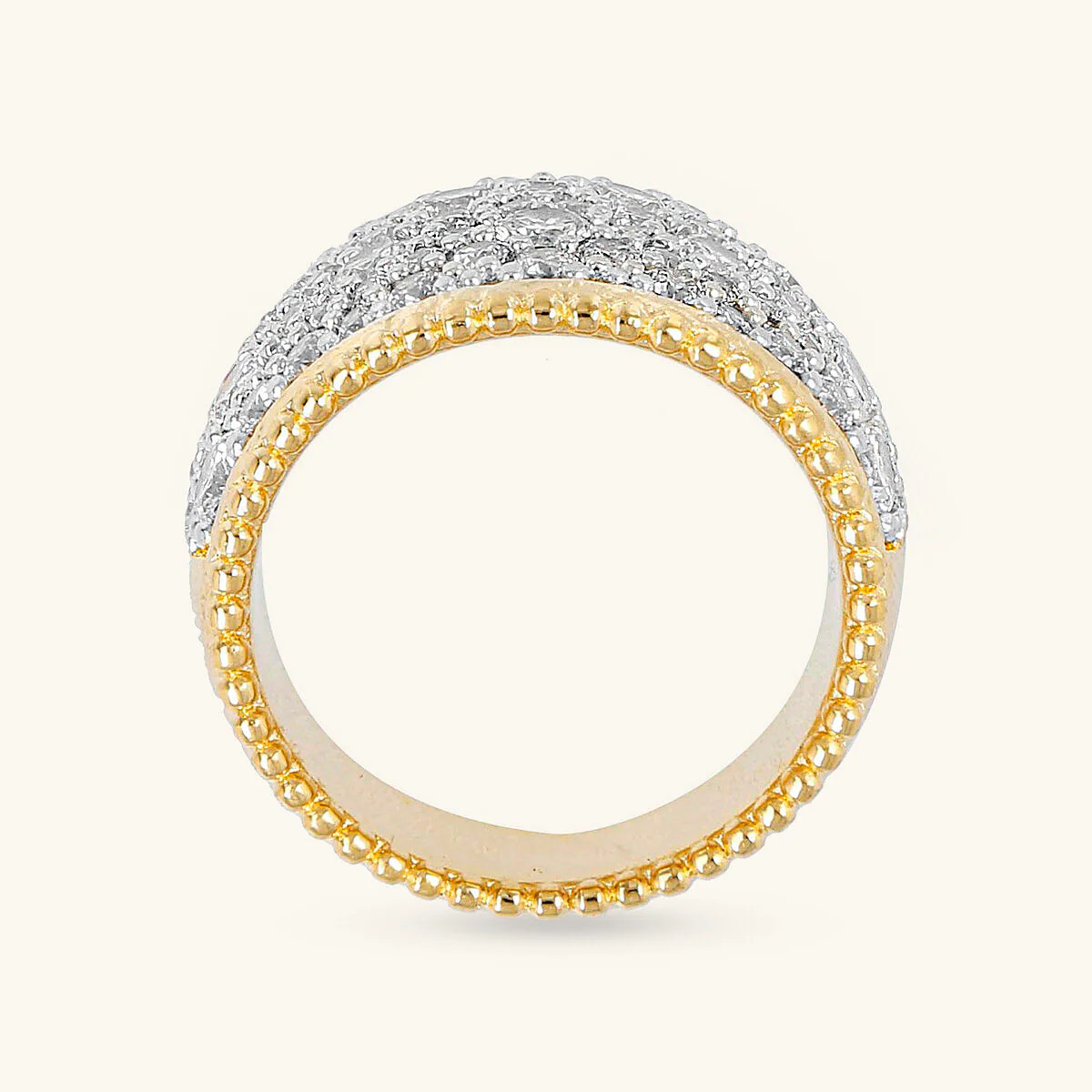 Anello a fascia realizzato in lega Golden, placcata oro giallo 18kt, dal design graduato con superficie pavé in cubic zirconia, qualità luminosa, e piccoli puntini in Golden.