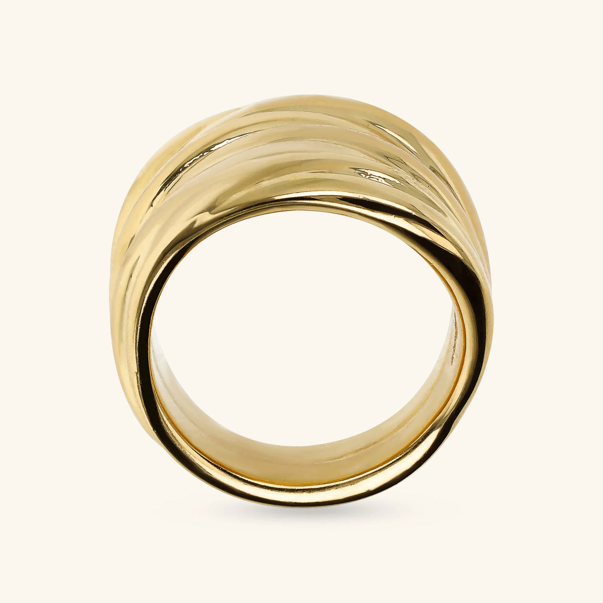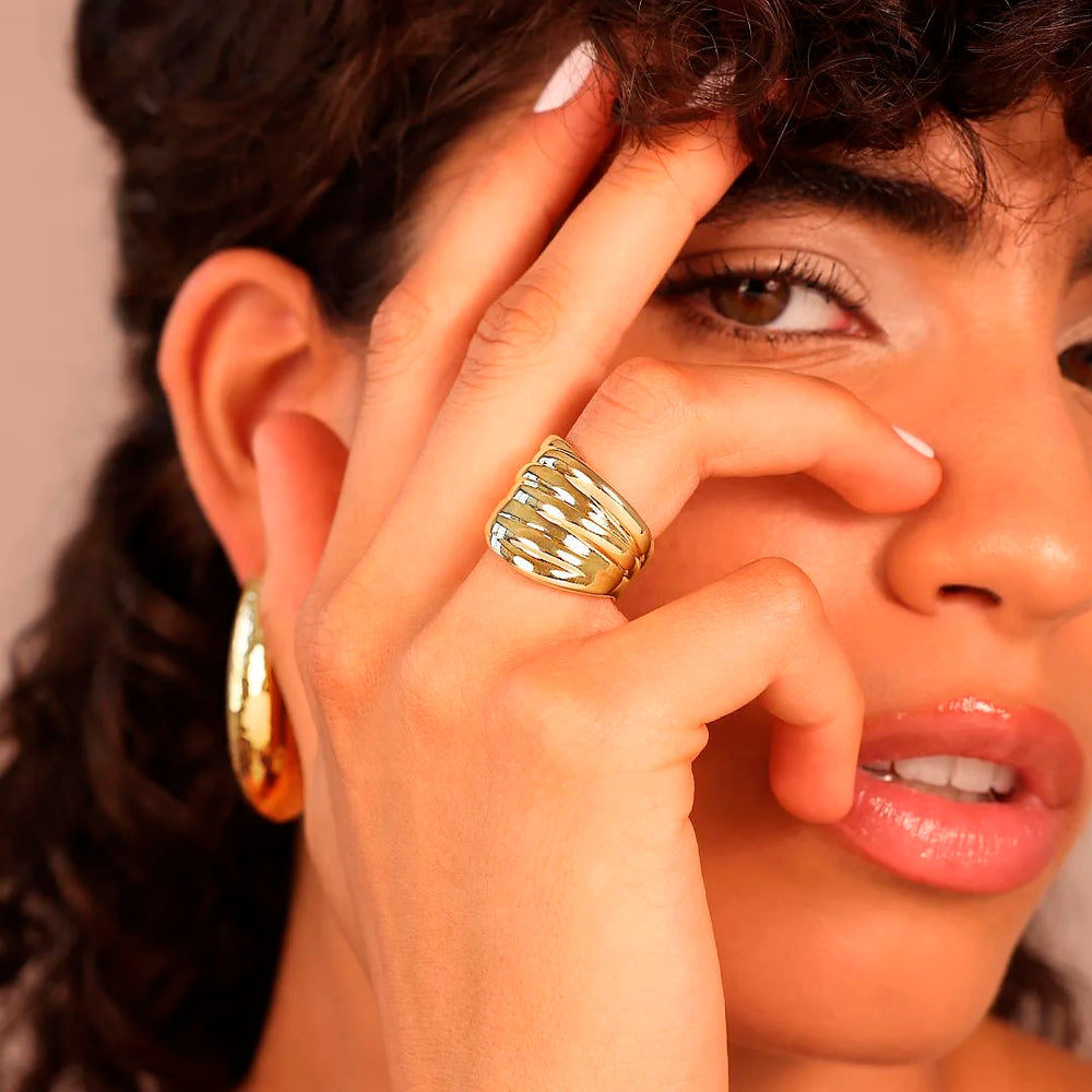 Anello a fascia realizzato in lega Golden, placcata Oro giallo 18kt, dalla texture rigata.