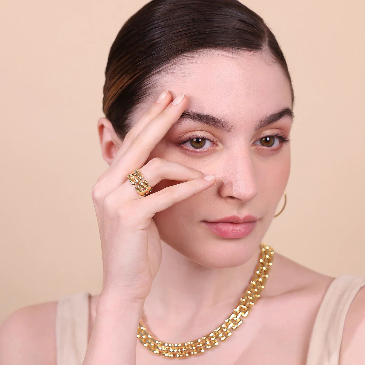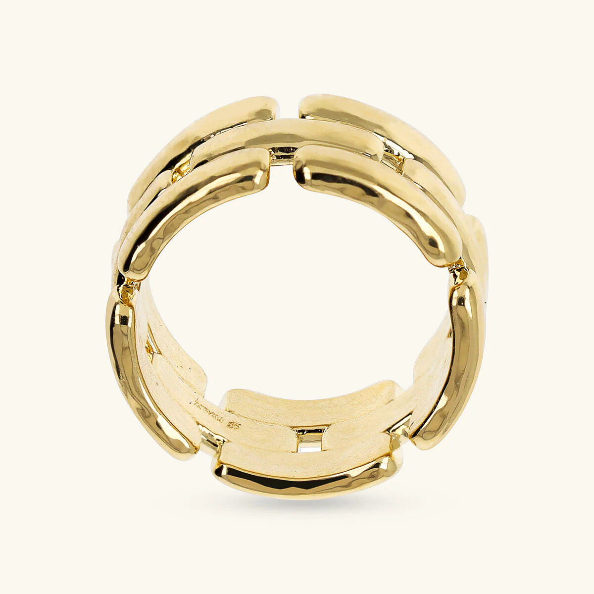 Anello a fascia, placcata oro giallo 18kt, con maglia pantera martellata.