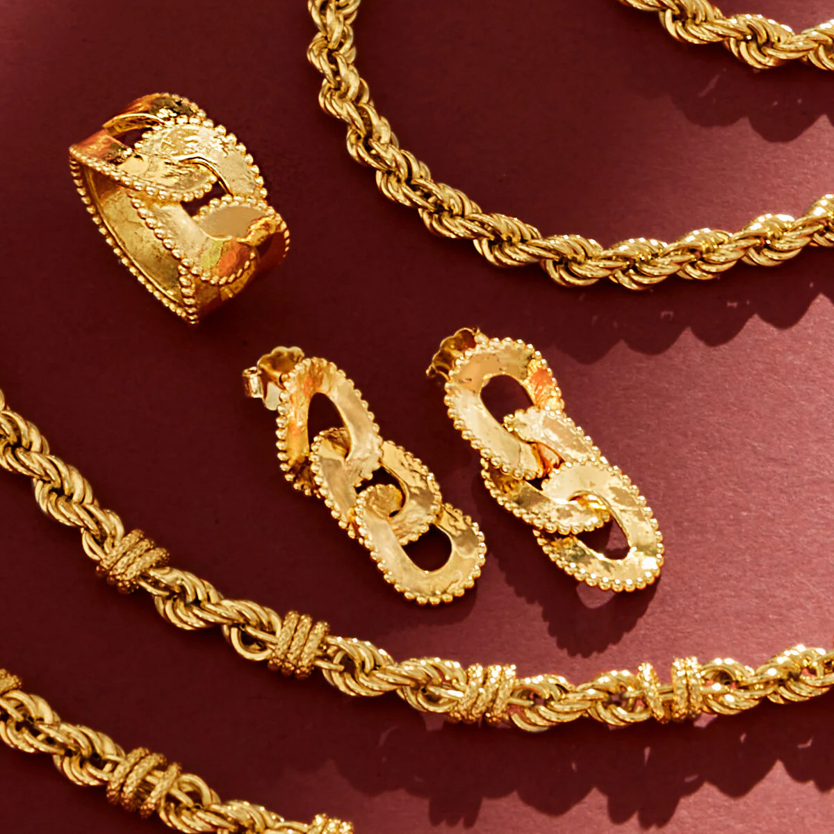 Anello a fascia realizzato in lega Golden, placcata oro giallo 18kt, con catena grumetta dalla superficie martellata e bordi in rilievo lavorato con palline.