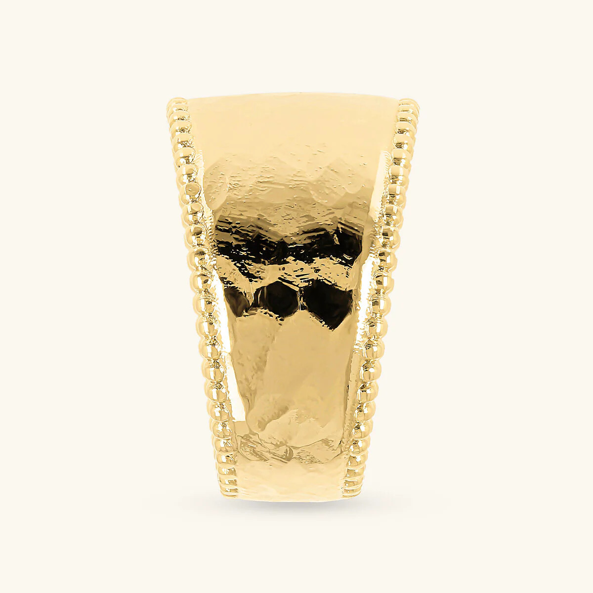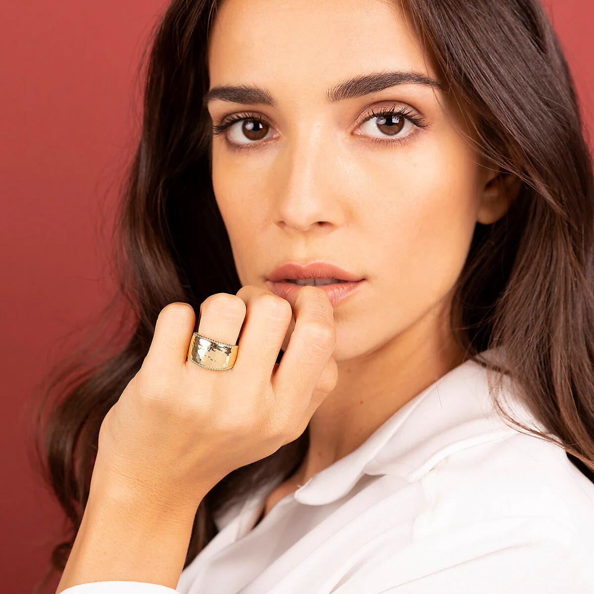 Anello a fascia graduato realizzato in lega Golden, placcata oro giallo 18kt, con superficie martellata e bordi impreziositi da piccole palline.