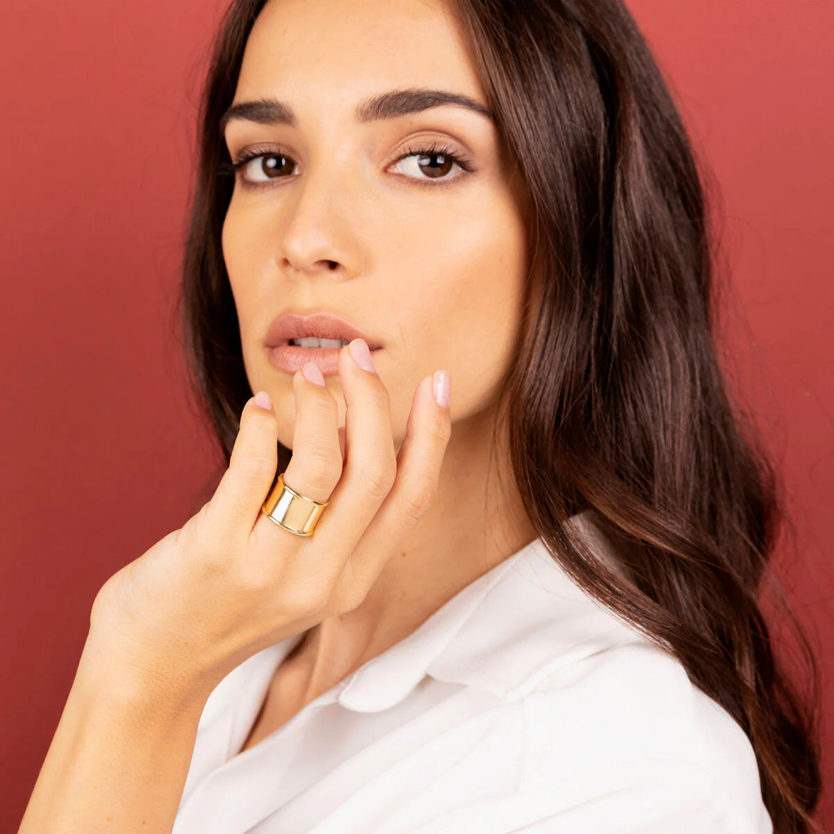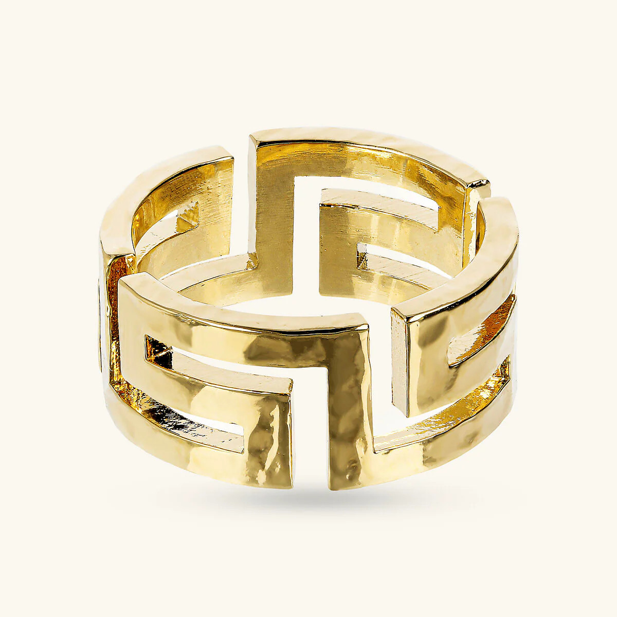 Anello a fascia realizzato in lega Golden, placcata oro giallo 18kt, con greca e superficie martellata.