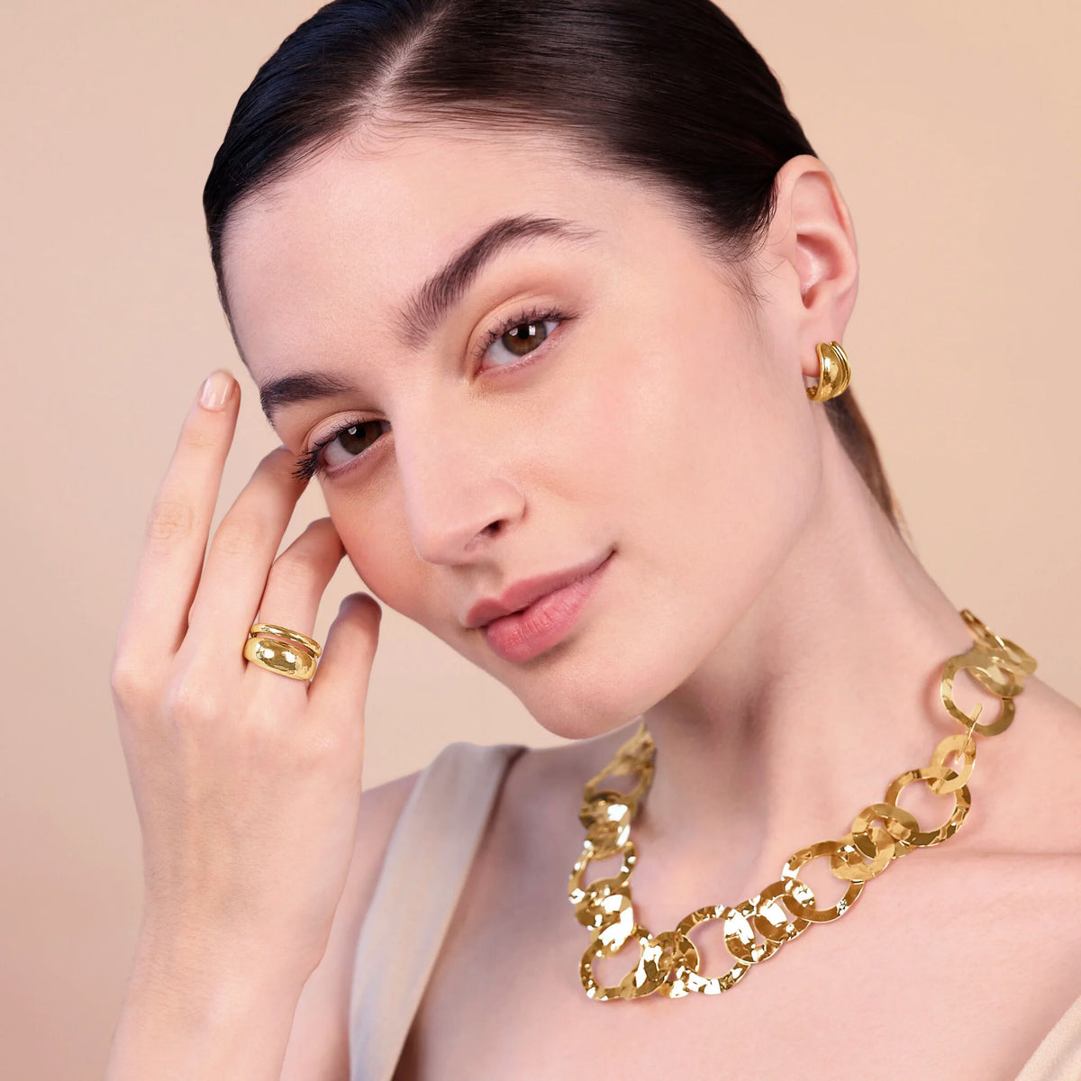 Anello a fascia realizzato in lega Golden, placcata oro giallo 18kt, con classica finitura martellata e dal design che sdoppia il prodotto in indossato come se si trattasse di due pezzi sovrapposti.