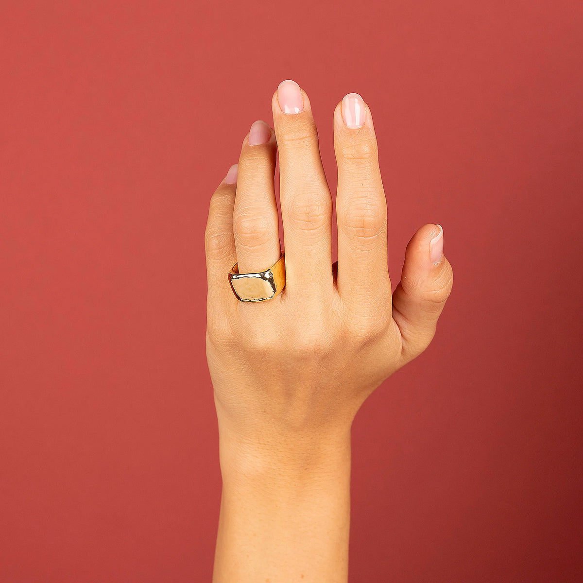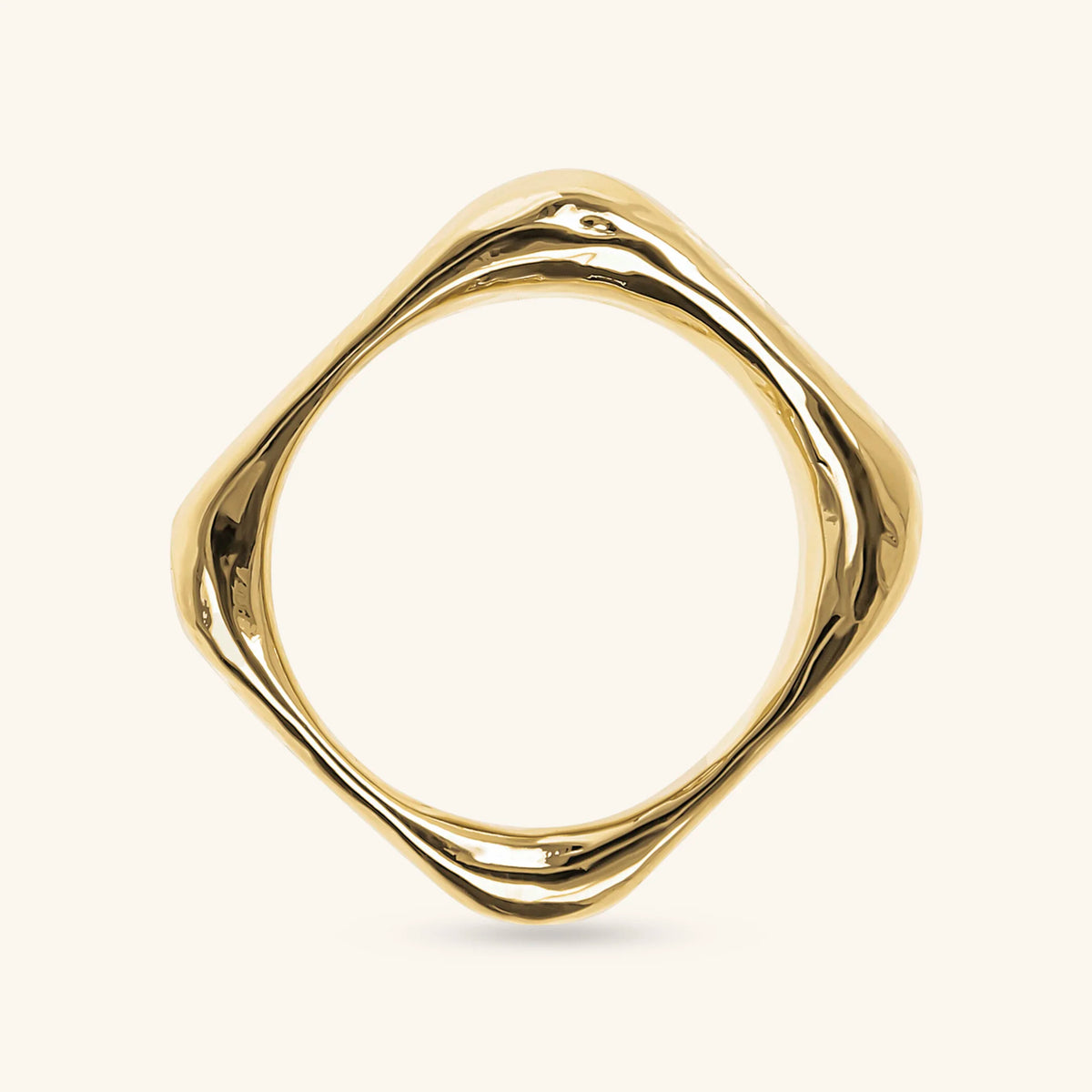 Anello a fascia realizzato in lega Golden, placcata oro giallo 18kt, dalla forma quadrata con superficie martellata.