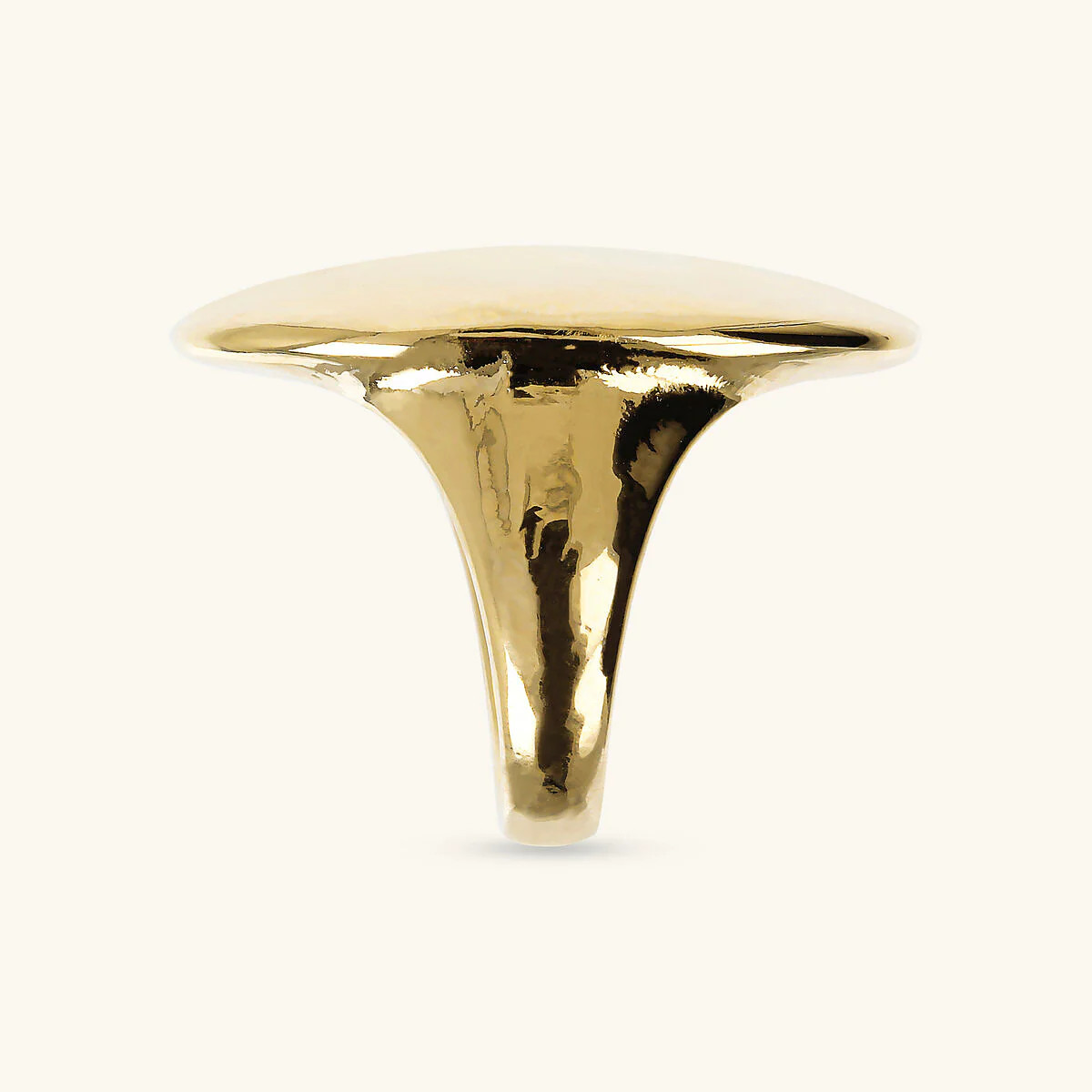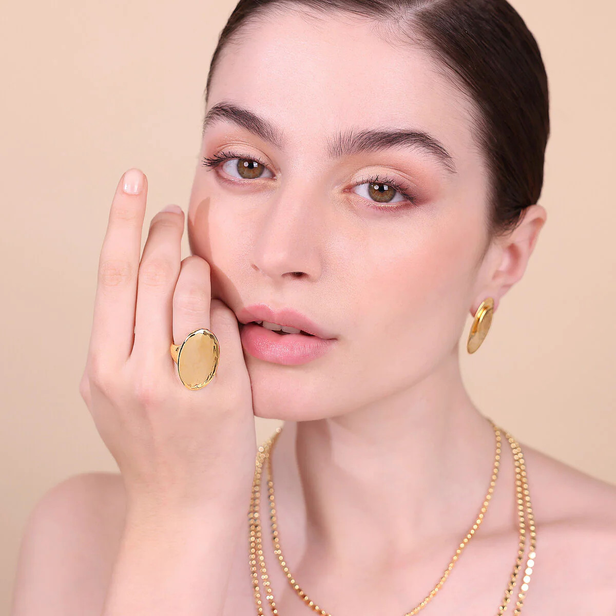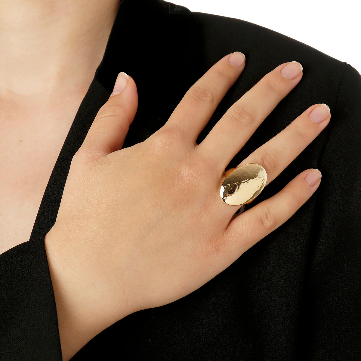 Anello chevalier realizzato in lega Golden, placcata oro giallo 18kt, dalla forma ovale con superficie martellata.