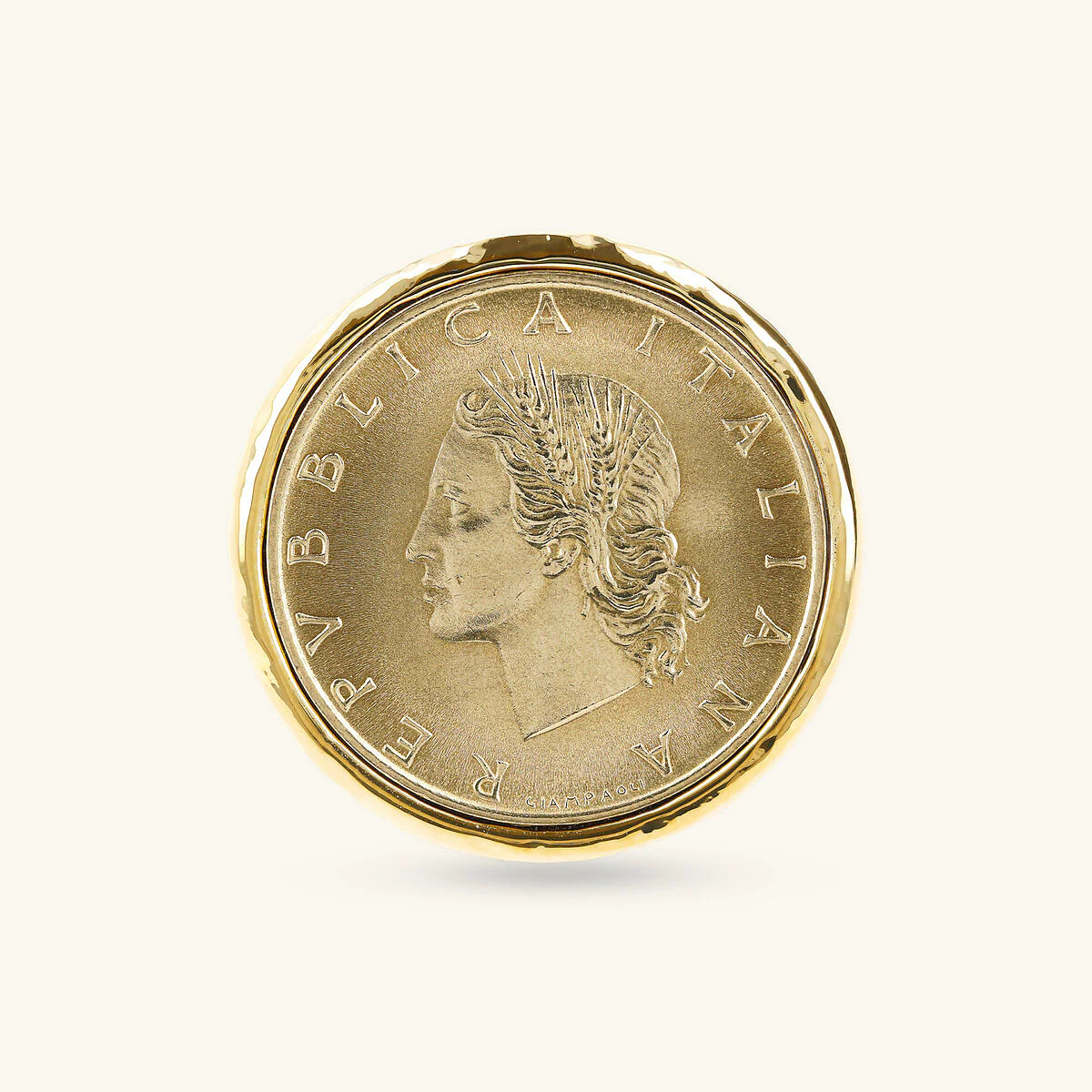 Anello chevalier Etrusca Gioielli realizzato in lega Golden, placcata oro giallo 18kt, con superficie martellata e impreziosito da una moneta originale.