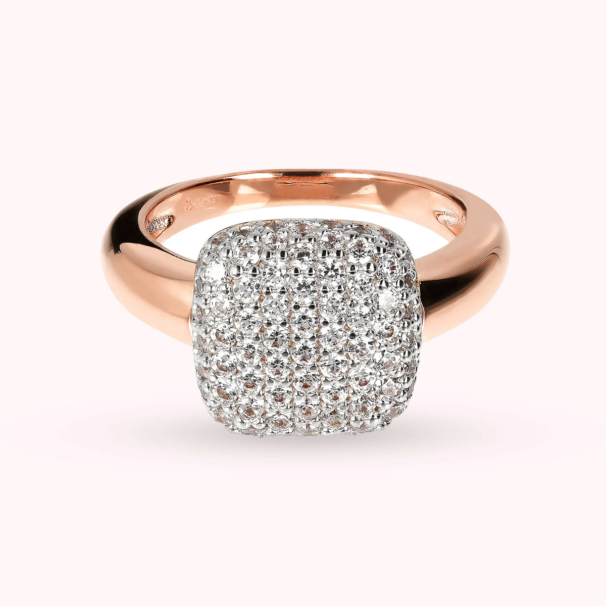 Anello cocktail realizzato in lega Golden Rosé, placcato oro rosa 18kt, impreziosito da un elemento quadrato pavé (12.5x12.5 mm) ricoperto interamente da cubic zirconia di colore bianco, qualità luminosa.