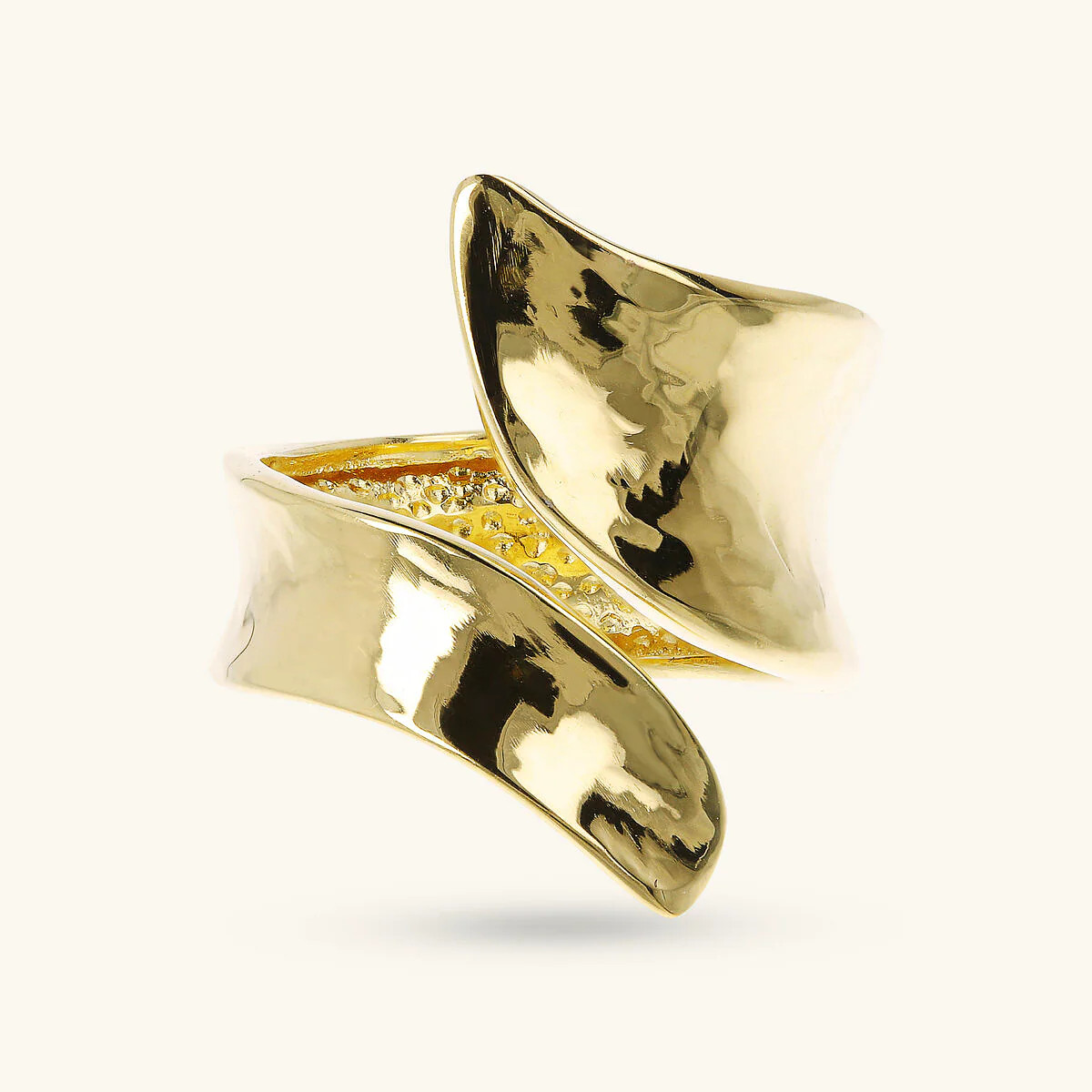 Anello contrarié realizzato in lega Golden, placcata oro giallo 18kt, dal design aperto, effetto onda, con superficie martellata.