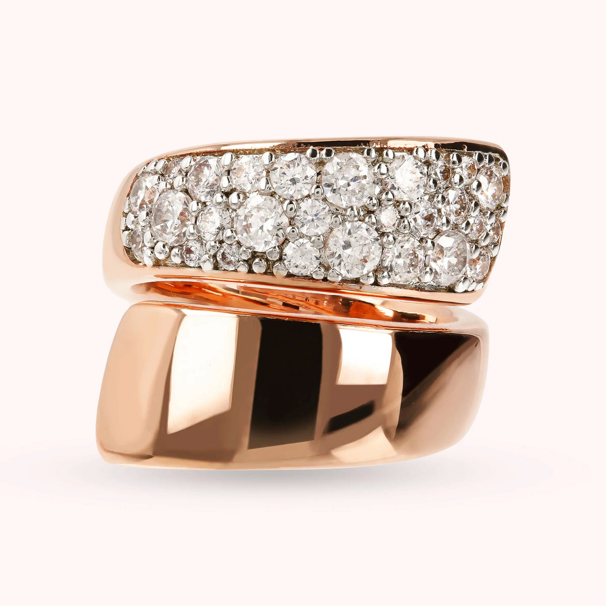 Anello contrarié realizzato in lega Golden Rosé, placcata oro giallo 18kt, impreziosito da due elementi a forma di foglia, uno dei quali con superficie pavé in cubic zirconia di colore bianco, qualità luminosa.