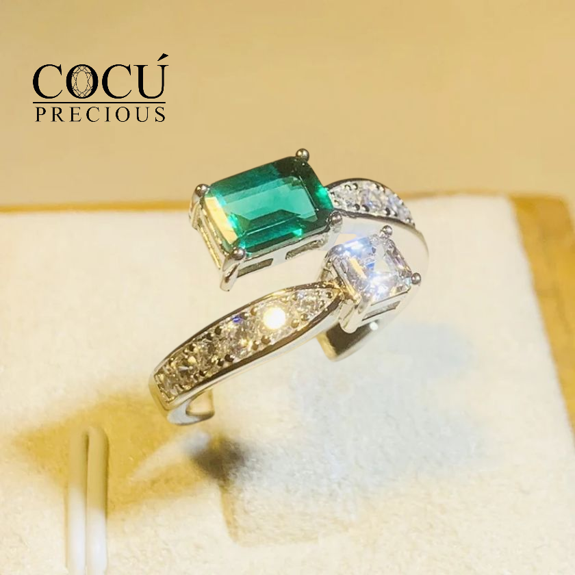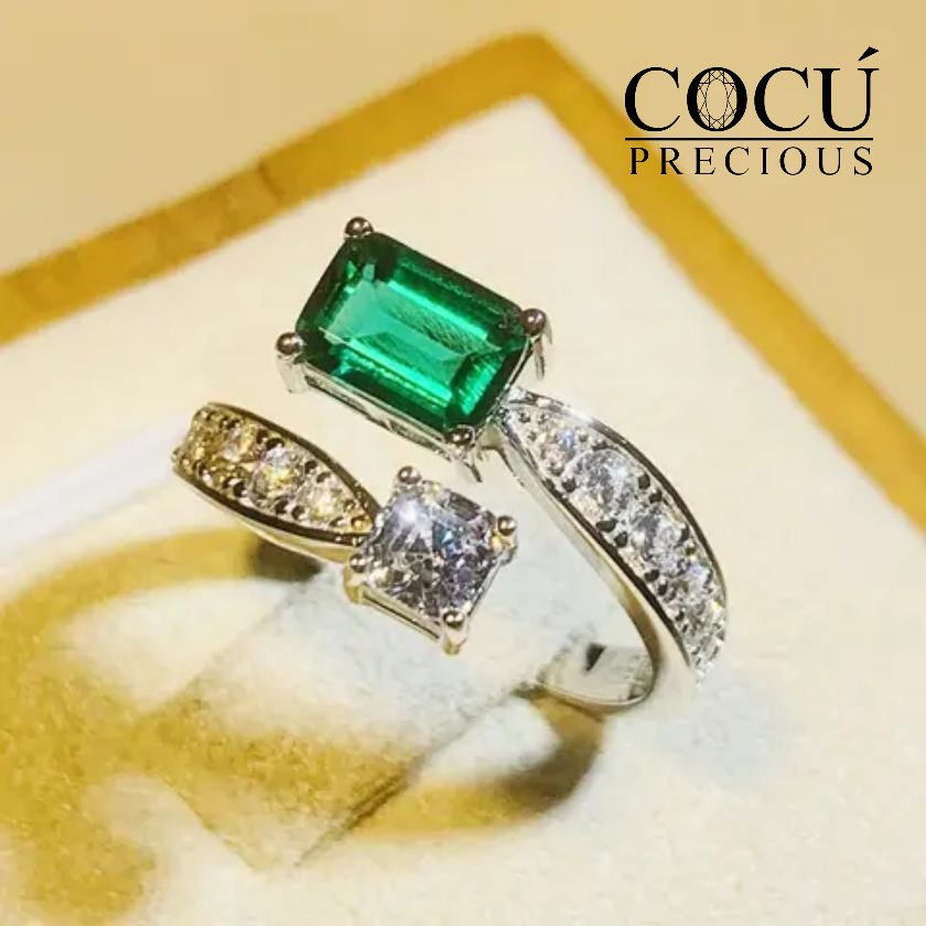 Anello Contrariè realizzato in oro bianco 18kt, con gemma di Smeraldo (provenienza miniere dello Zambia) di 2,30 carati e al lato opposto con Diamante taglio Princess da 0,50 carati certificato IGI G color vs1 Attorniata ai lati da diamanti DEF color vs (0,30 ct totali), qualità e taglio execellent.