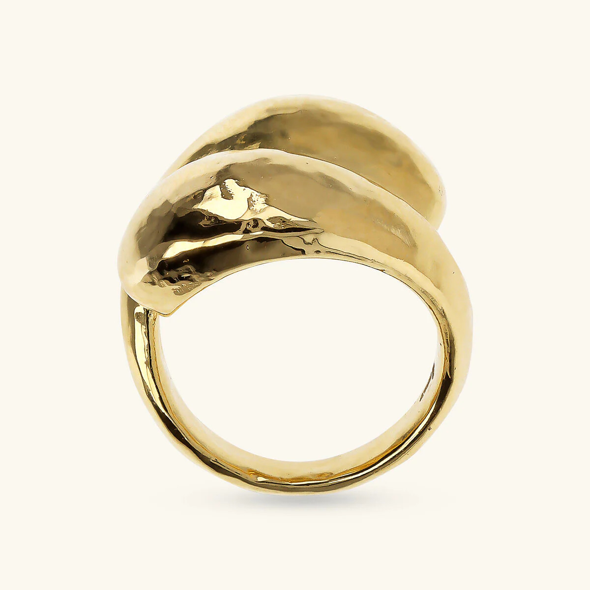 Anello contrarié realizzato in lega Golden, placcata oro giallo 18kt, impreziosito da una particolare forma che richiama quella del serpente con superficie martellata.
