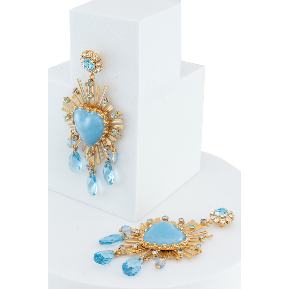 Orecchini in ottone dorato con cristalli e smalto Azzurro perlato. H10cm L 4,8cm