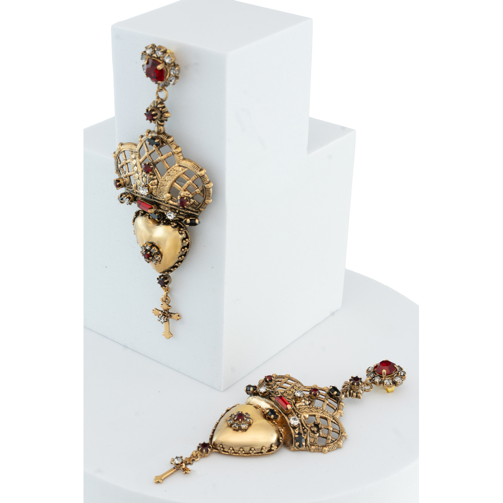 Orecchini in ottone dorato e invecchiato con cuore, cristalli e corona, chiusura a pernio. H 11,5cm L 4,4cm