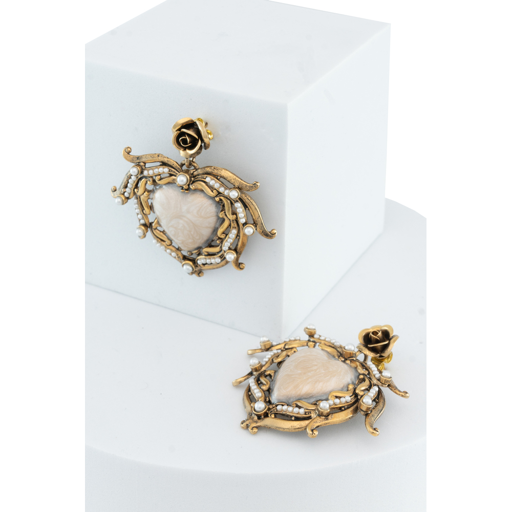 Orecchini barocchi a lobo realizzati in ottone dorato e invecchiato, con perle e cuore smaltato perlato, chiusura a perno. H 5,5cm L 5,7cm