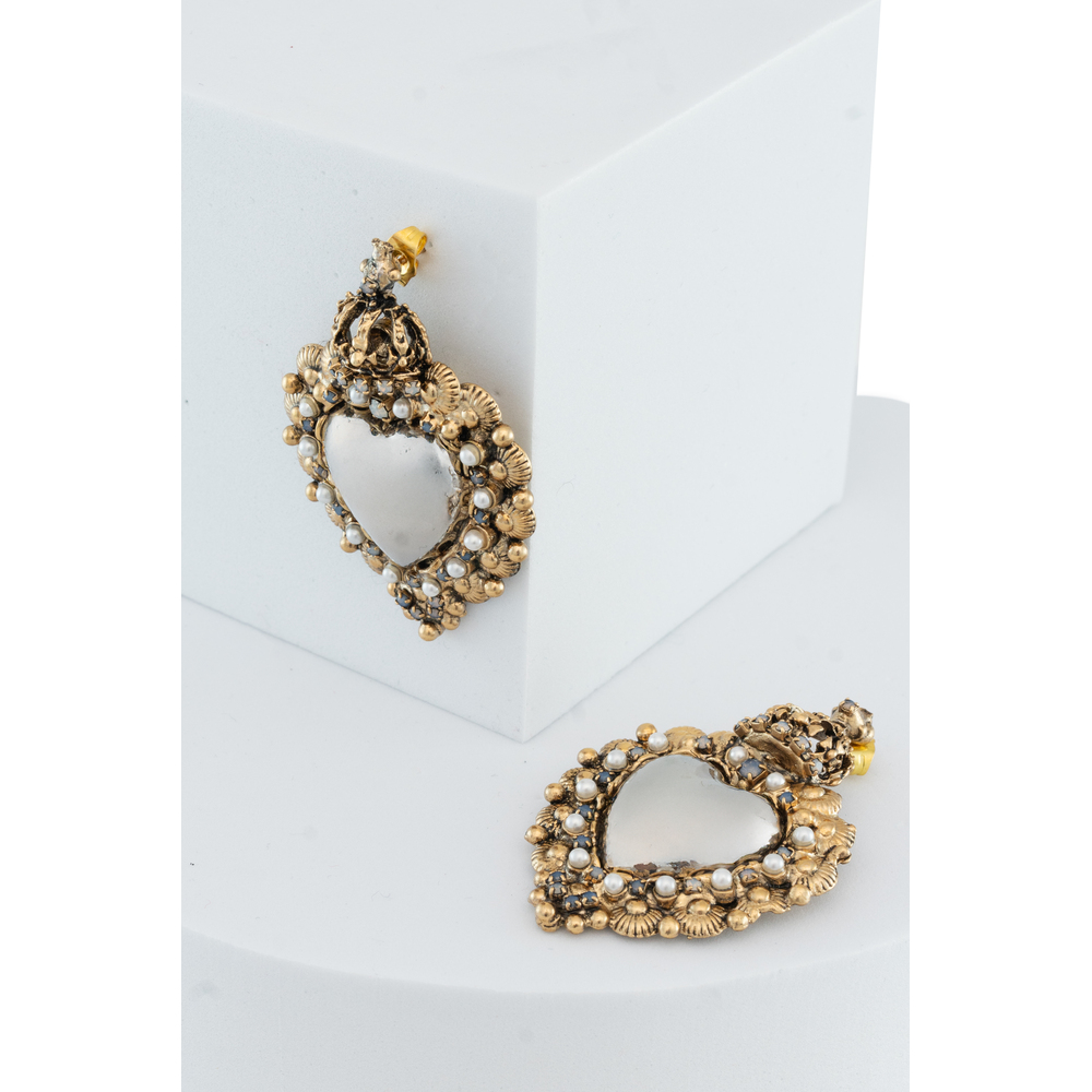 Orecchini in ottone dorato e invecchiato con cristalli e perle e cuore argentato, chiusura a pernio. H 5,8cm L 4cm