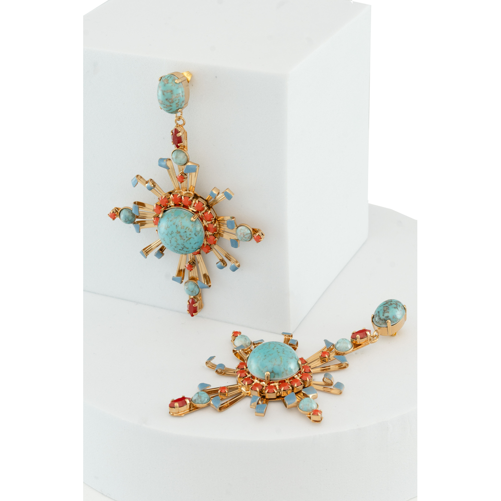 Orecchini in ottone dorato con cristalli turchesi Matrix e smalto, chiusura a pernio. H 9,7cm L 6cm