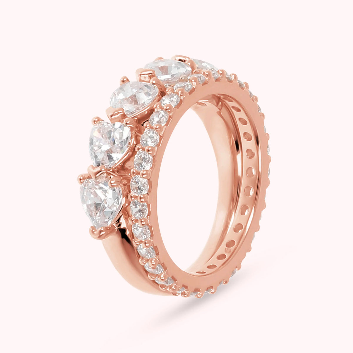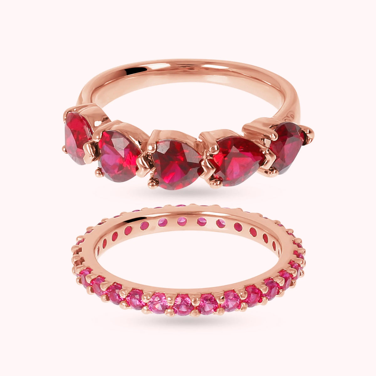 Set di anelli realizzati in lega Golden Rosé, placcati oro rosa 18kt. Il set è composto da un anello riviera con cuori realizzati in cubic zirconia di colore rosso, decorati con dei piccoli e raffinati zirconi bianchi e da un anello veretta interamente ricoperto da piccoli e raffinati zirconi bianchi. Creazione elegante, dal design perfetto per rendere unico il tuo look.