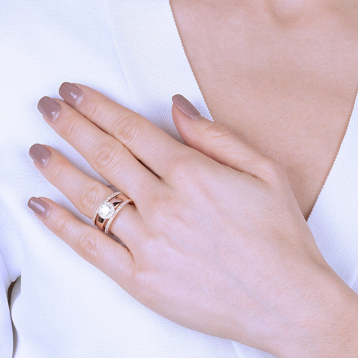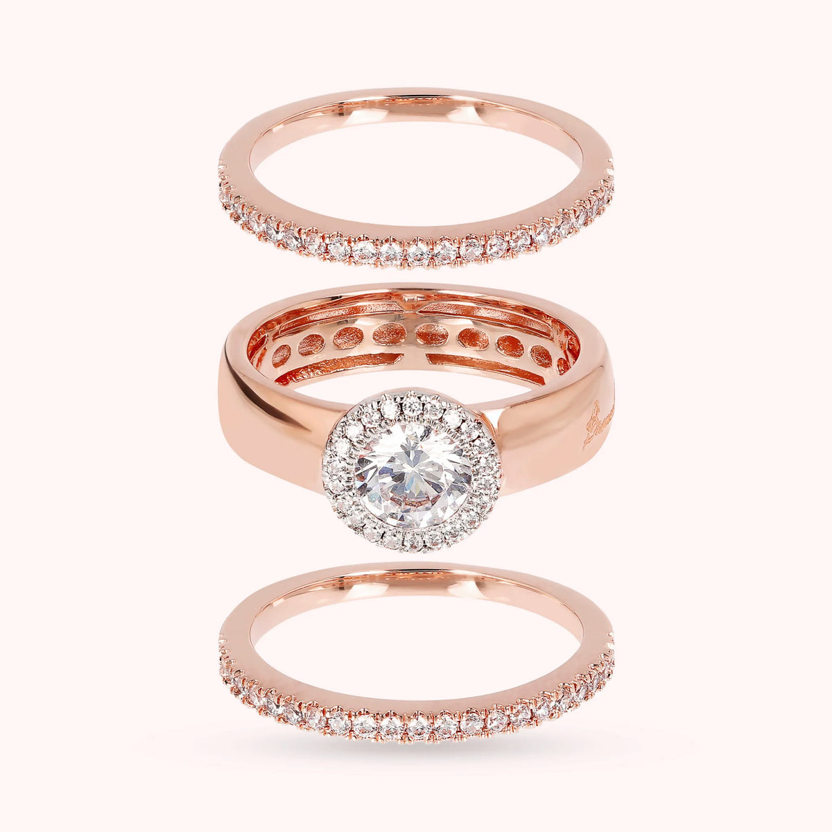 Set di anelli realizzato in Golden Roé placcato oro rosa 18kt. Due anelli a veretta con riviera di cubic zirconia che circondano un solitario con pietra centrale e ghirlanda in cubic zirconia. Creazione elegante, dal design perfetto per far brillare il tuo look. Lega brevettata Golden Rosé
