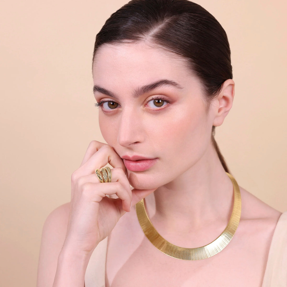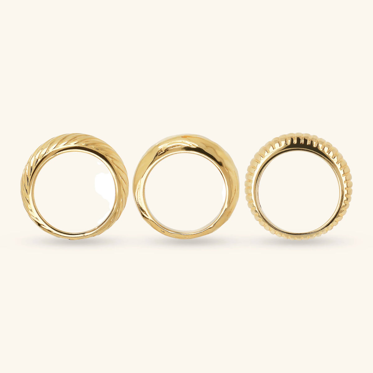 Set di anelli realizzati in lega Golden, placcata oro giallo 18kt, composto da una fedina con superficie delicatamente martellata, una fedina con texture a righe verticali e una fedina con texture a righe oblique.